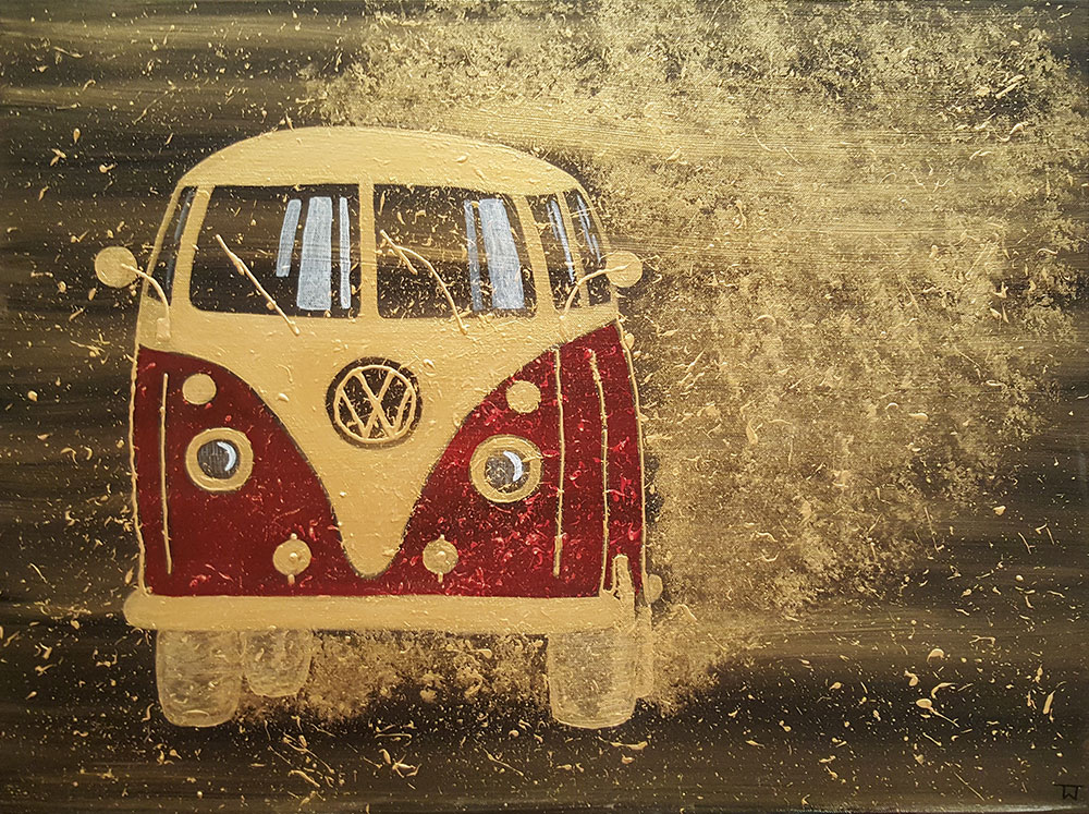 Man soll ja noch Träume haben und ich träume immer mal wieder von einem VW-Bus. Am liebsten mag ich den T1, die sind leider inzwischen fast unbezahlbar, seufz. Nun ja, jetzt habe ich mir eben einen gemalt mit wilder Spritztechnik, ein bisschen Sandpapier und anderen Spielereien.