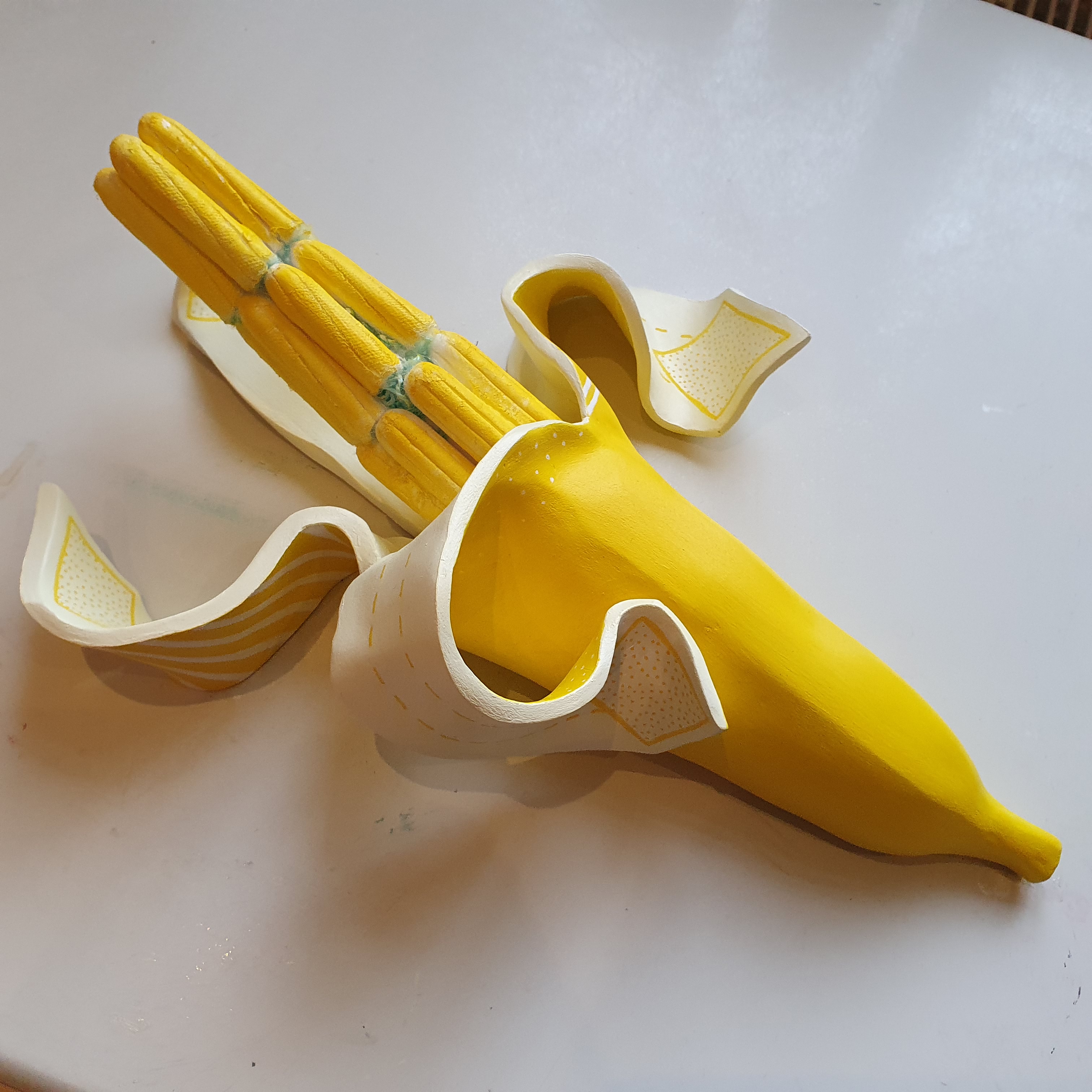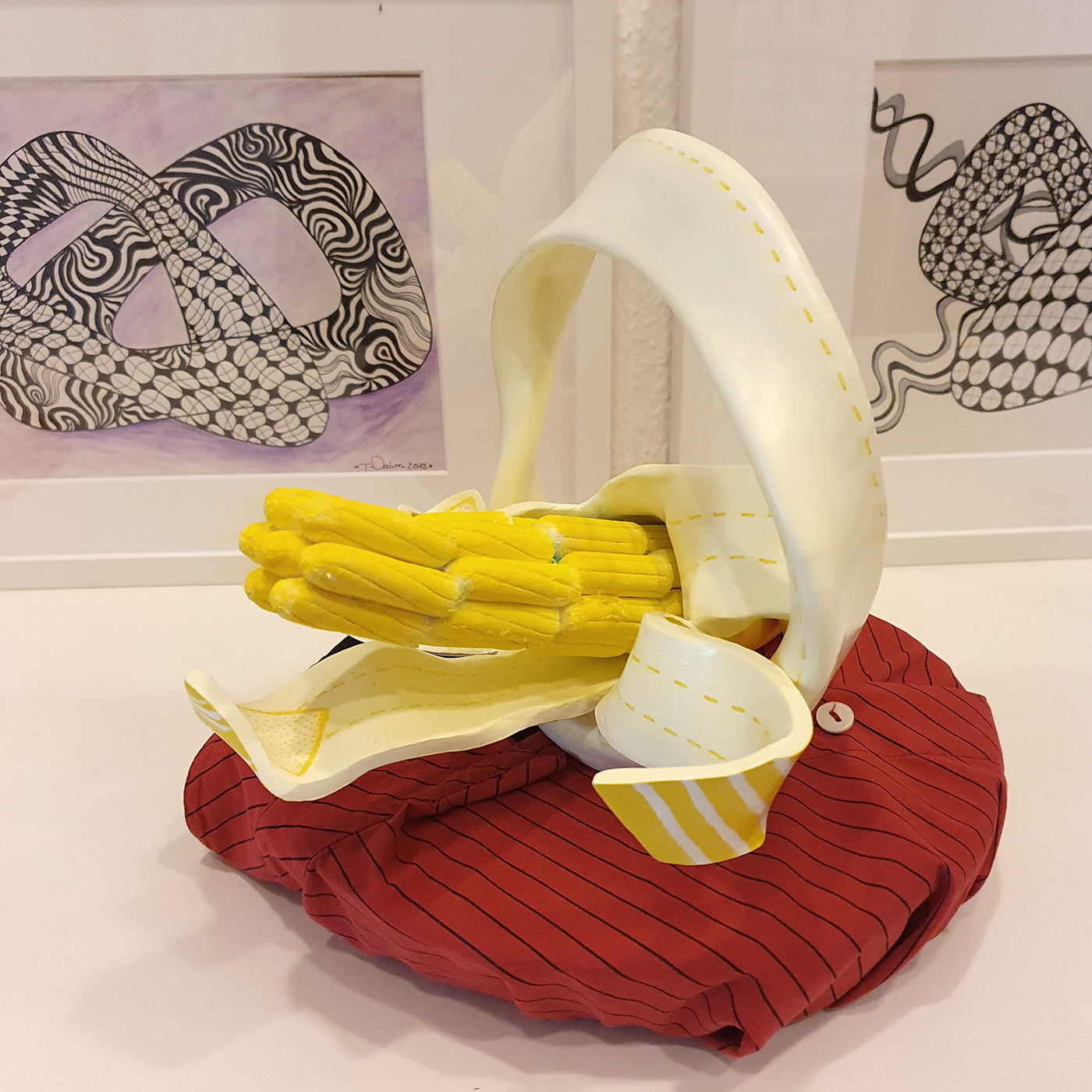 My work contrasts the feminine – the tampons – and the masculine – in the form of the banana itself as well as the peel that ends up as a tie.