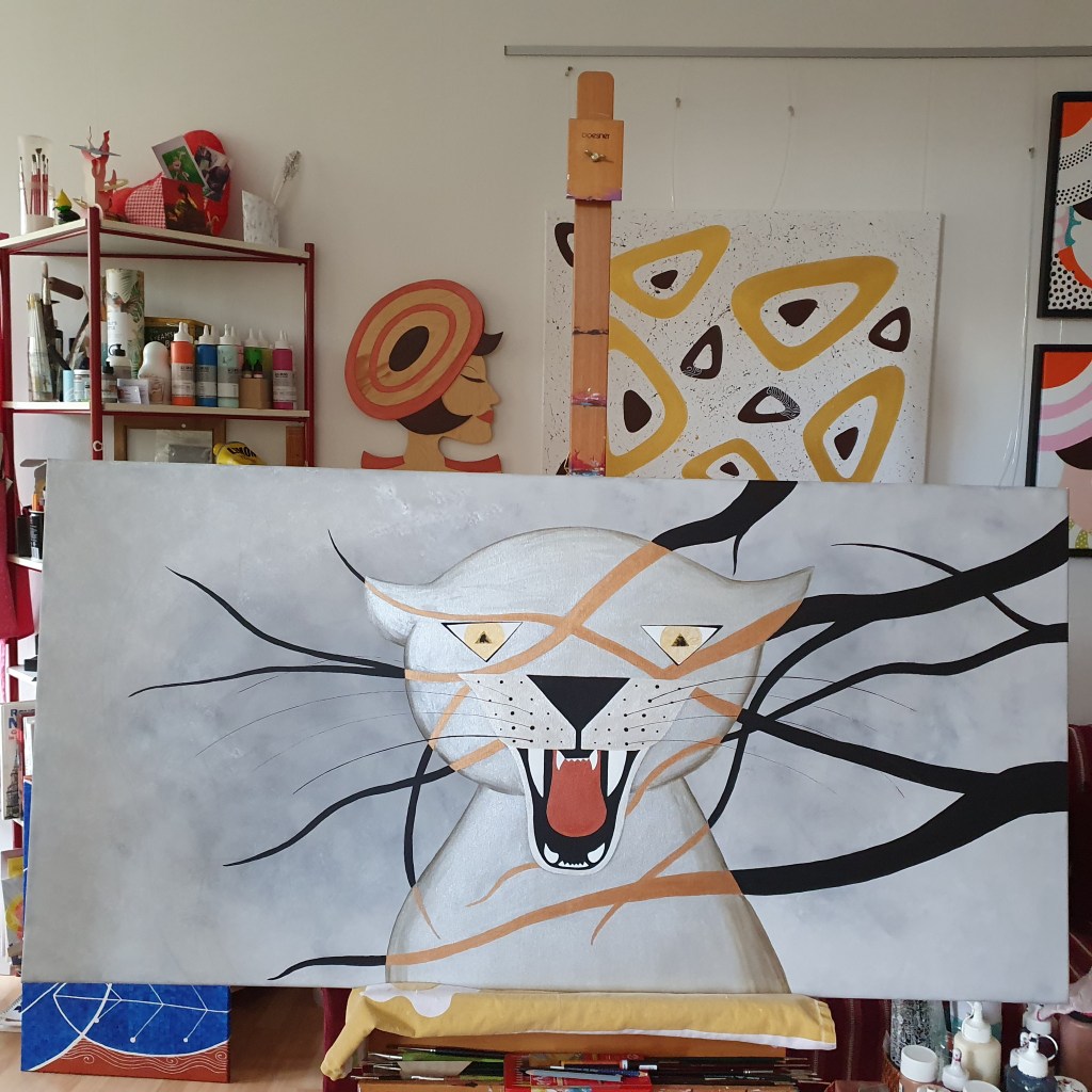 I think animals are incredibly exciting and so I painted a powerful, rather illustrative panther or cougar. Even though they always torment me, I chose metallic colors again and the result is even more vivid.
