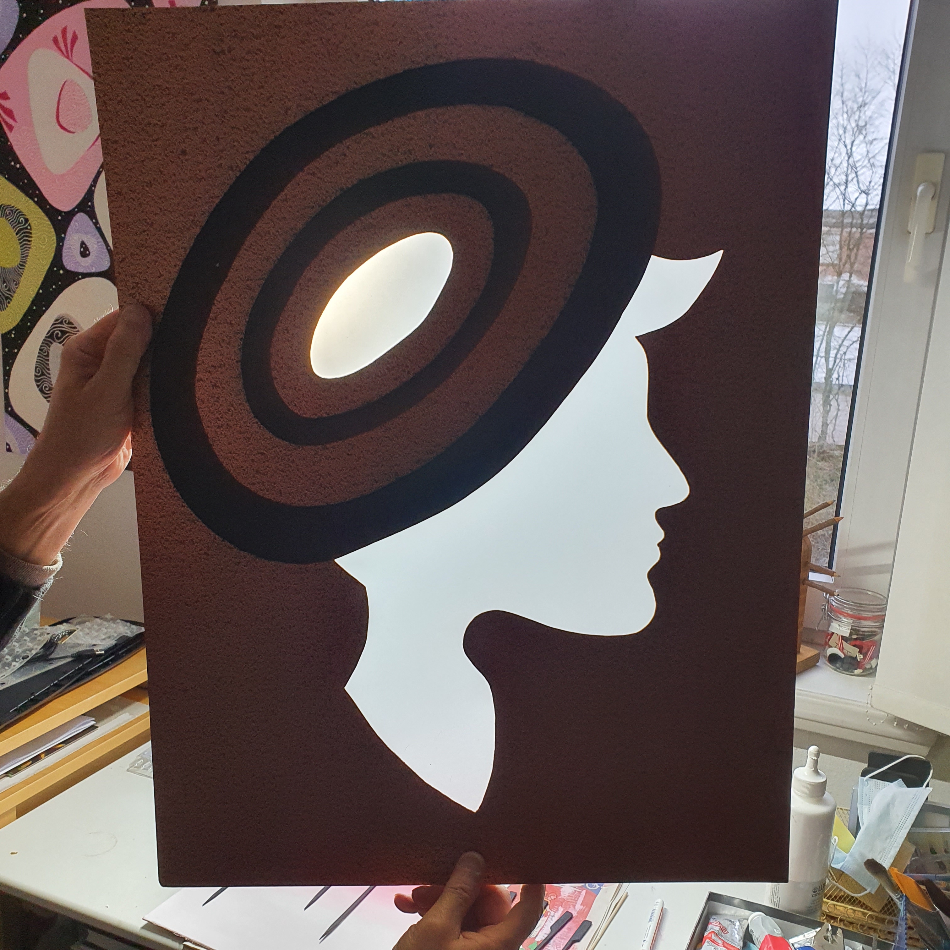 Ist es die letzte Lady? Ich weiß es nicht sicher, auf jeden Fall sollte es ein etwas anderes Werk werden. Ich hatte die Idee eines Leuchtrahmens bzw. einer Lampe mit einer Metalloberfläche. Nach längerer Suche fand ich ein Werkstück und kämpfte etwas mit dem Sägen. Final fügte ich ein Leuchtband ein, baute einen Rahmen und bemalte die Oberfläche mit Acrylfarben.