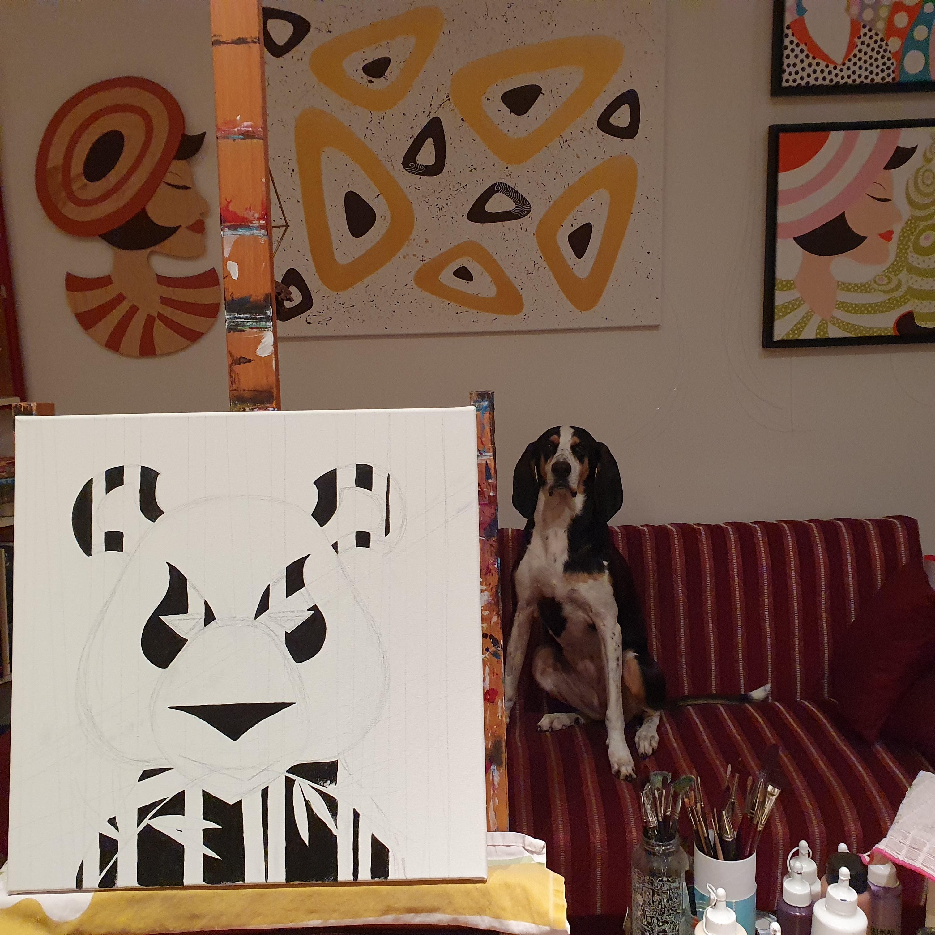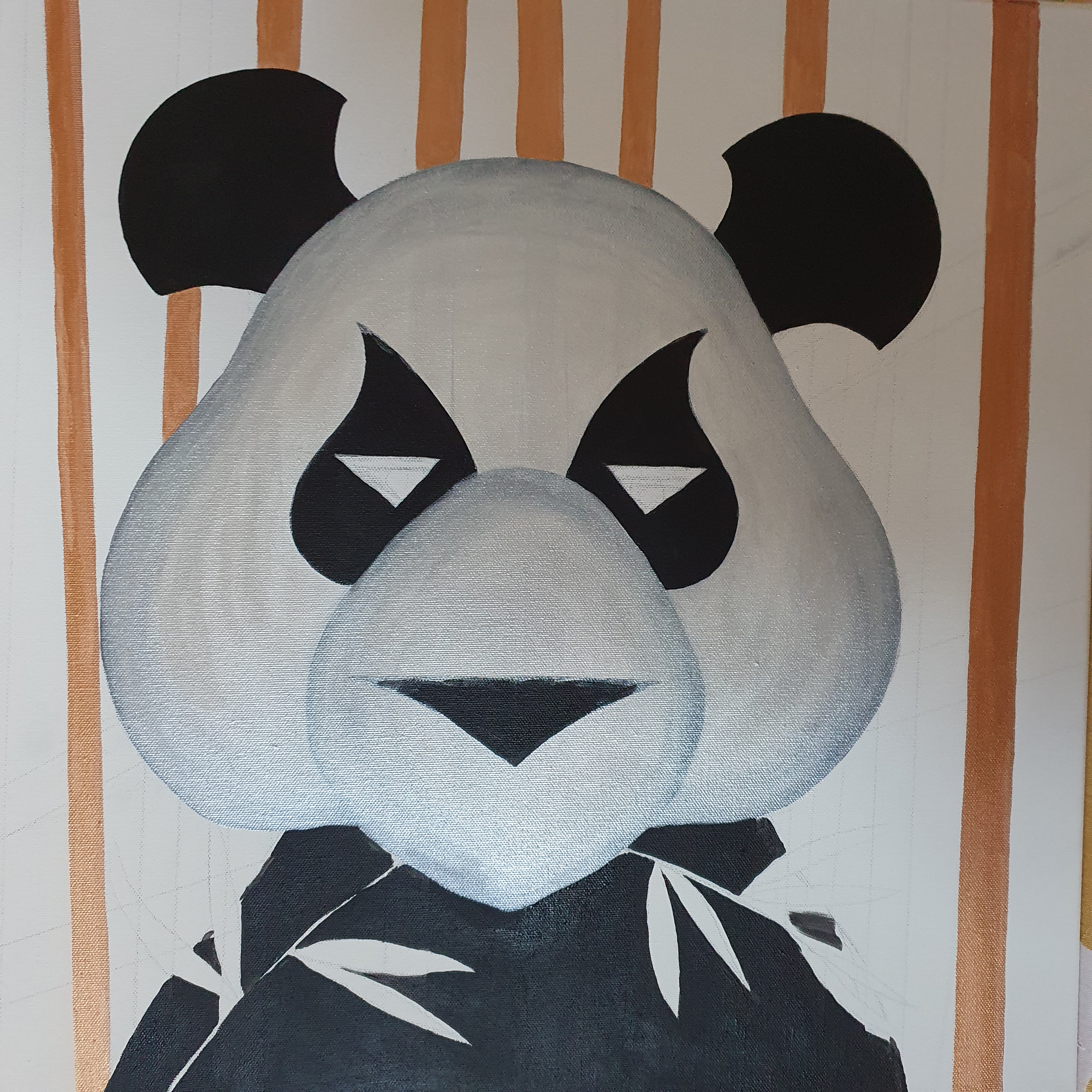 Ich liebe diese friedlichen und leider bedrohten Pandas. Wie beim Panther wählte ich bewusst abstrahierte Formen und spielte erneut mit dem Hintergrund. Die Muster dürfen wohl einfach nicht fehlen.