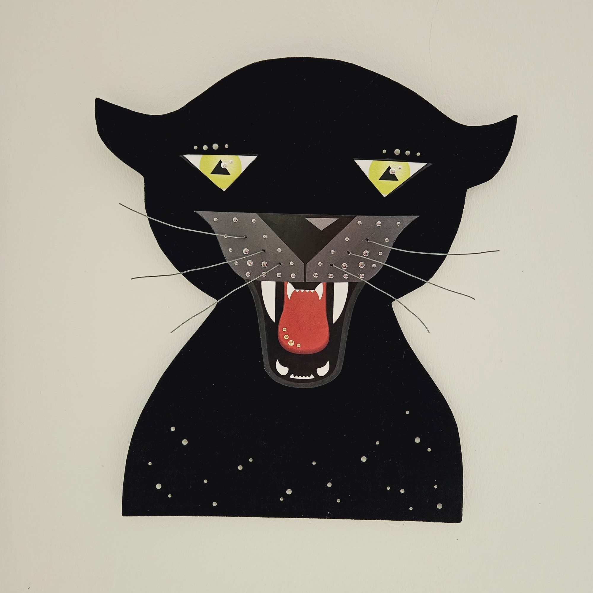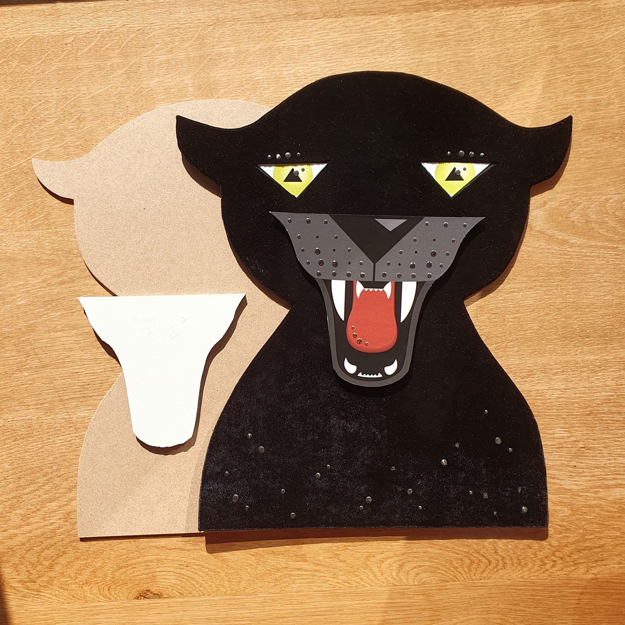 Sometimes it just has to be a bit more. And so I used the illustration I had created a second time and let the shape itself take on its effect. I additionally covered the basic body with a black velvet fabric. This brought back memories of my kindergarten days, because the combination of a bit of glue on my fingers and fabric fluff… As you can imagine, my hands almost became one with my work. Like the first one, I constructed the snout on a second layer and also added the wire whiskers. As the icing on the cake, I glued on small metal plates.