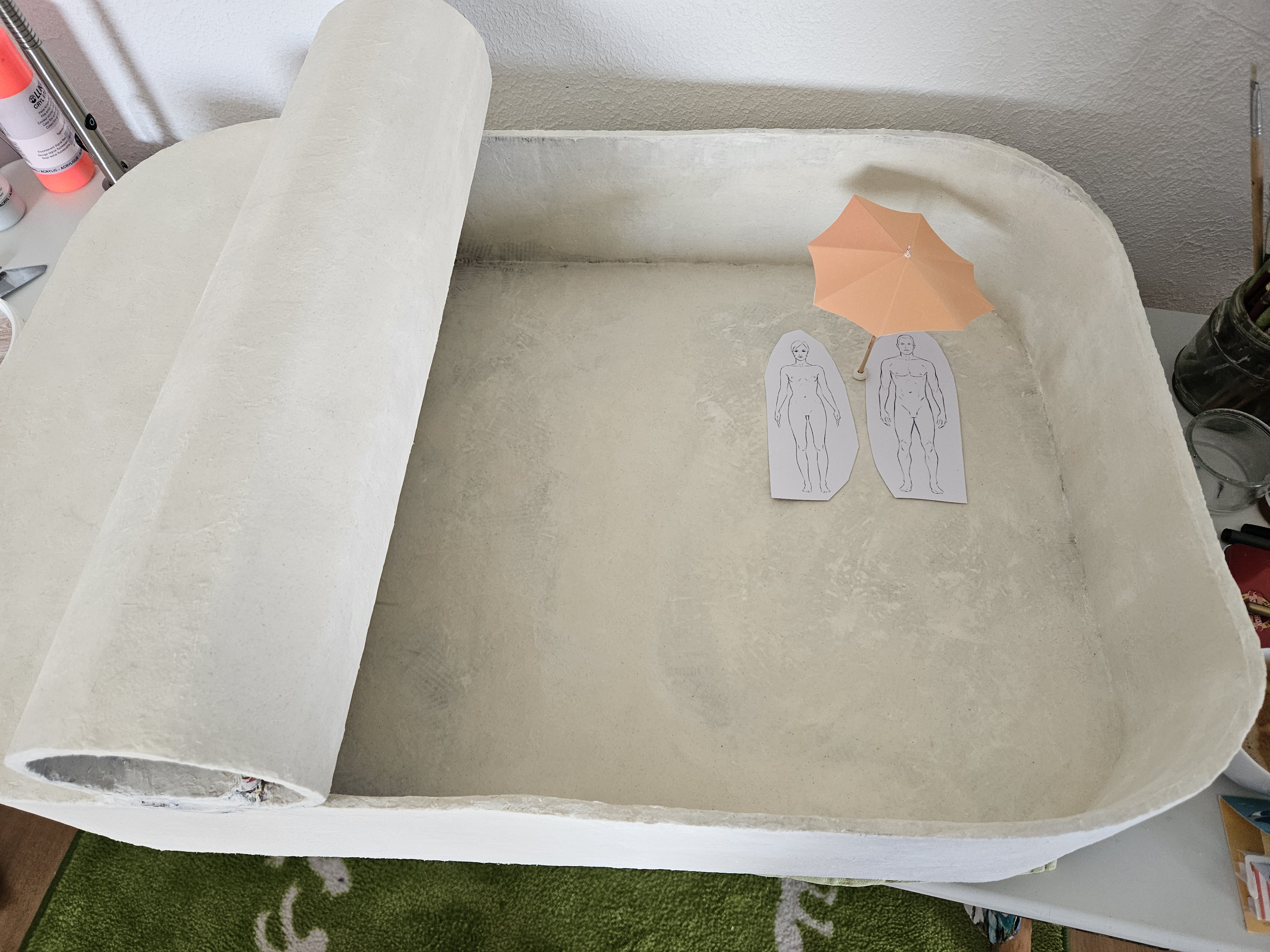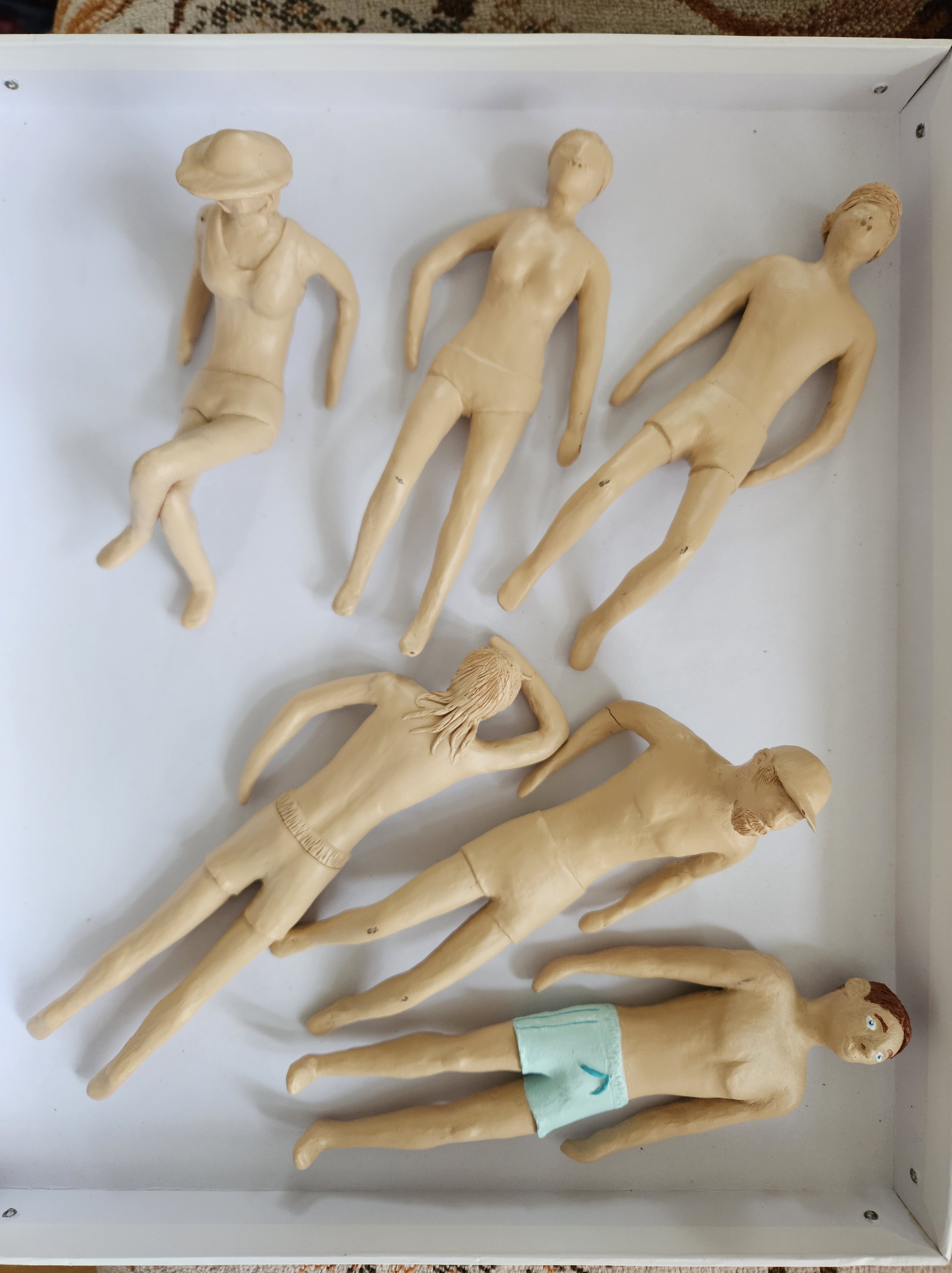 The sea: a real place of desire. While we often dream of empty beaches, which of course advertising is delighted to encourage, it ends up being more like this: there they – or better we – lie like sardines or herrings on the beach. In my head, the image of a tin can with a beach scene quickly emerged. On the beach you find individuals of great diversity and beauty, well, that’s in the eye of the observer.I had to smile a little myself when I stumbled across the question while modeling the little people: Who actually dangles their legs like that? Here and there I reached into the cliché box a little.