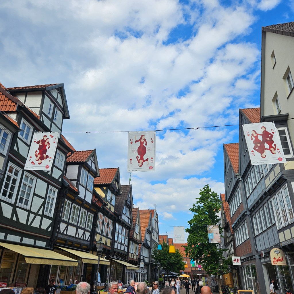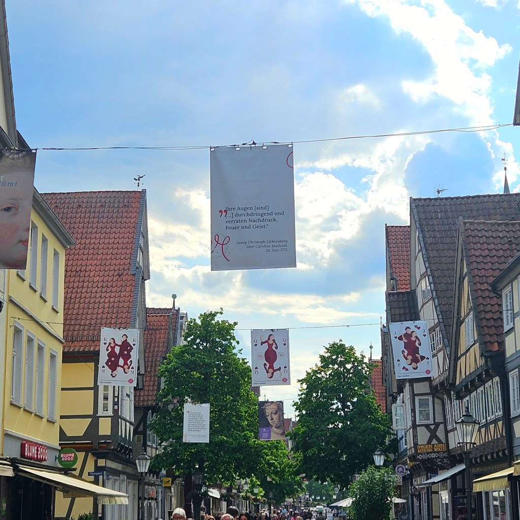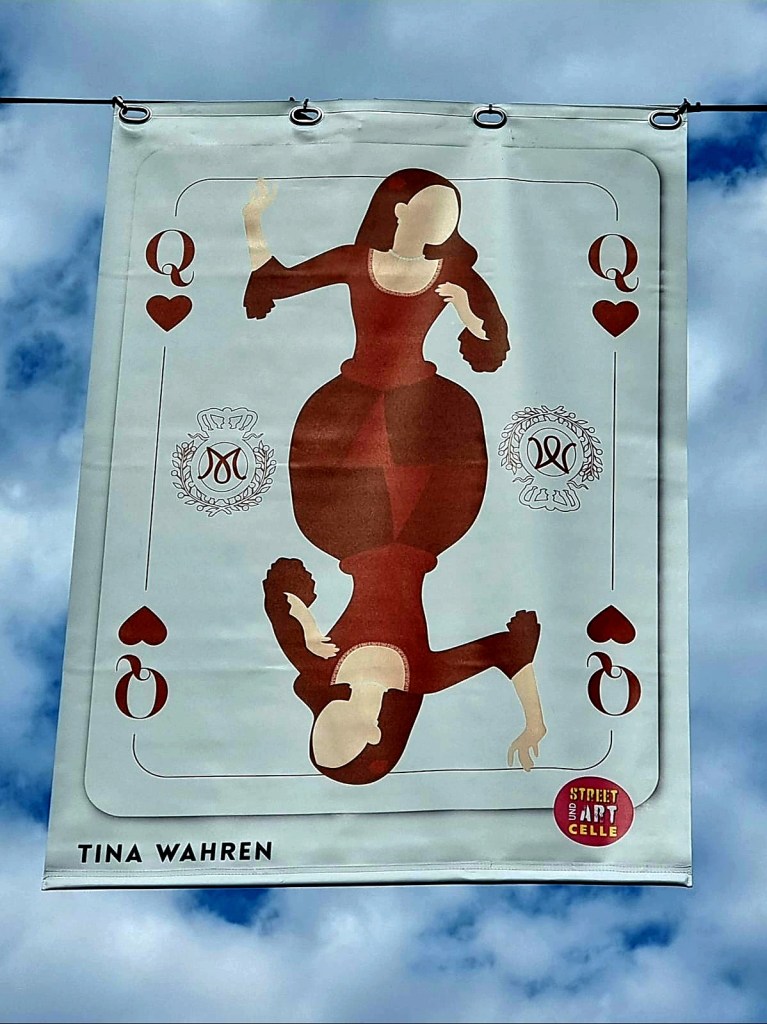 What a dramatic life: At the age of merely 15, she was married to her cousin King Christian VII and became Queen of Denmark and Norway. He was mentally unstable and brought a new personal physician with him from a trip to Altona: Johann Friedrich Struensee. After initial skepticism, a ménage-à-trois developed. One of the ways in which I set it up was as a card game (Jack: Queen Caroline with her lover Struensee | Queen: the Queen with the Order of Matilda | King: Queen Caroline turned away from King Christian VII). After a few intrigues, Struensee lost his head – in the truest sense of the word – and Caroline went into exile in Celle. The STREET & ART Celle team had banners printed for the Caroline Mathilde goes modern art exhibition. The three playing cards – as well as many other exciting works – will be hanging in the center of Celle (Zöllnerstraße) for a few weeks. Thanks for this great opportunity to the STREET & ART Celle team, the freiraum Celle team and the Residenzmuseum.