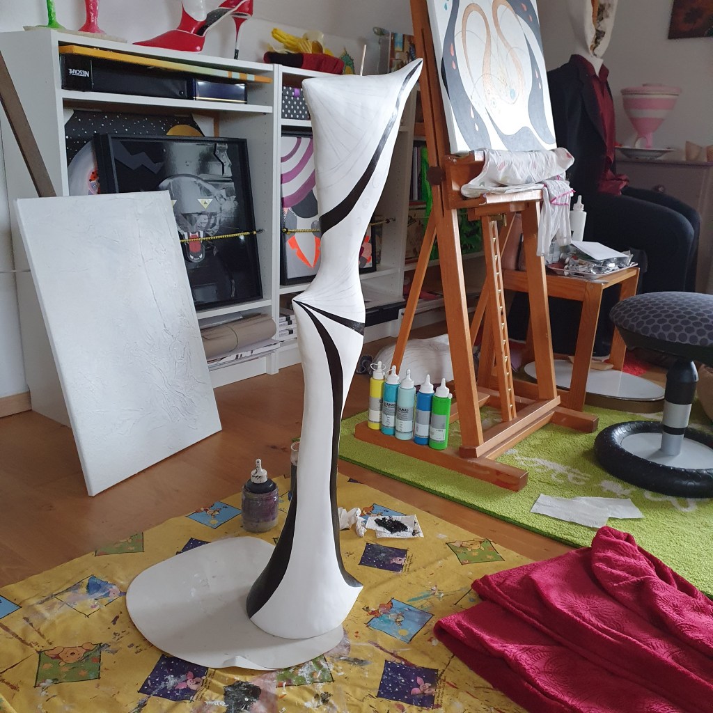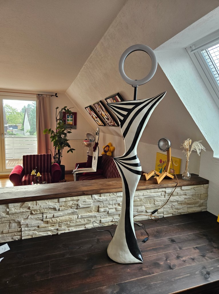 Manchmal lassen mich Formen einfach nicht los. In diesem Fall habe ich erst eine Lady aus Holz gesägt und im Garten aufgestellt. Es folgte eine Zeichnung und später die Umsetzung in 3D. Das Werk war schon relativ weit, da hatte ich die verwegene Idee, dass der Kopf leuchten könnte. Glücklicherweise konnte ich diese Idee noch umsetzen und nach einigen Recherchen fand sich auch die passende Lampengröße. Nun leuchtet der Kopf – und das auch noch in verschiedenen Farben, die sich über die eingebaute Fernbedienung am Kabel umschalten lässt.
