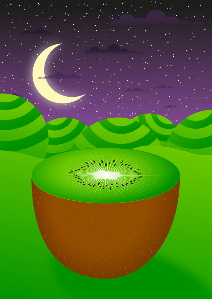 Those who know me are aware of my love of wordplay and languages. I got the idea for the kiwi from a dear friend who wrote charming stories for her son. Over time, the idea grew into a vector-based illustration of an ice-skating kiwi bird skating on a sliced kiwi fruit.