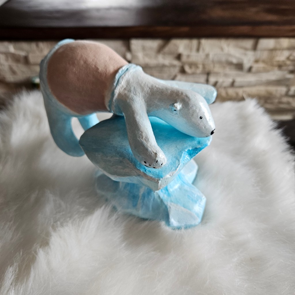 The illustration “The Sad Polar Bear” is based on a papier-mâché figure I created for an installation. It was a little too small for the freezer, and after groundwater flooded the basement, the polar bear is one of the few “survivors.” Even though the topic of climate protection has become somewhat overused, it still affects me deeply. So I redrew the polar bear on his melting ice floe digitally using Adobe Illustrator. At first, I found it a little too cute, but in the end I managed to make it more serious.