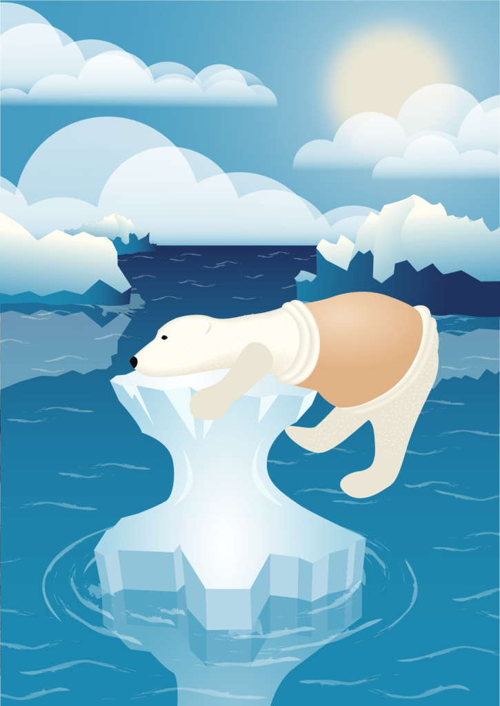 Die Illustration „Der traurige Eisbär“ basiert auf einer Figur aus Papiermaché, die ich für eine Installation fertigte. In der Kühltruhe war dieser etwas zu klein und nach Grundwasser im Keller ist der Eisbär einer der wenigen „Überlebenden“. Auch wenn das Thema Klimaschutz inzwischen etwas überstrapaziert ist, mich lässt es nicht kalt. Und so zeichnete ich den Eisbär auf seiner schmelzenden Scholle noch einmal digital mit Adobe Illustrator. Zu Beginn geriet mir dieser etwas zu niedlich, doch final gelang der Sprung zu größerer Ernsthaftigkeit.