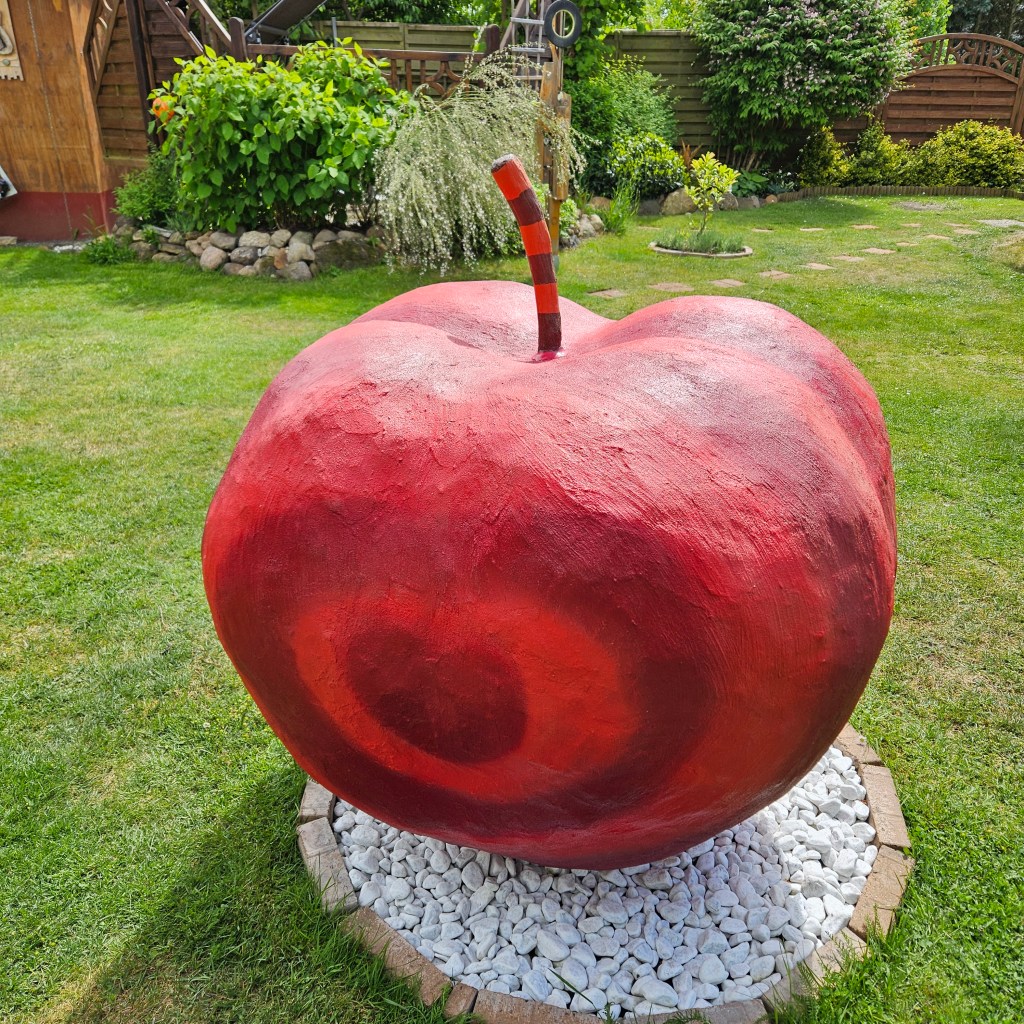 Many years ago, I painted the Lovely Fruit Apple – graphically simplified and inspired by a heart cut from a fresh apple. A small series featuring various fruits was created. I enjoy developing objects and am always testing out new materials. And yes, sometimes it just has to be big. That’s how this piece came about, which now adorns our garden.