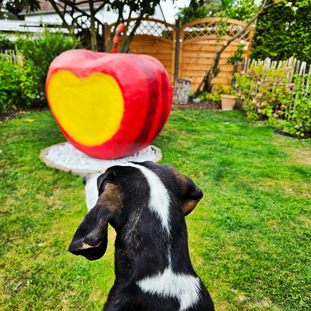 Vor vielen Monden malte ich den Lovely fruit Apfel – grafisch reduziert und inspiriert durch ein aus einem frischen Apfel geschnittenes Herz. Eine kleine Serie mit verschiedenen Früchten entstand. Ich habe Spaß an der Entwicklung von Objekten und teste immer wieder Materialien. Und ja, manchmal muss es eben groß sein. So entstand dieses Werk, das nun unseren Garten ziert.