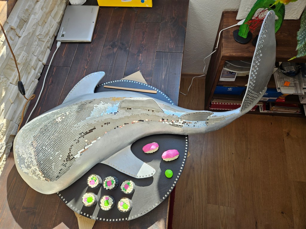 Diese Wandskulptur kommt recht stylish daher, hat allerdings einen tieferen Sinn. Ich gebe zu, ich esse gerne Fisch, ob dieser nun gesund ist oder nicht, es ist ein Streitthema. Und natürlich schwingt das Thema Überfischung bzw. illegaler Fischfang mit jedem Bissen mit. Dieses Werk entwickelte sich unverhofft. Der anfangs – in jeder Hinsicht – harmlose Walhai mit Echtglas-Spiegelfliesen erzählte mir allein nicht genug. Und so kamen eine schwarze Platte nebst Sushi hinzu. Eine kurze Recherche ergab, dass auch Walhaie teilweise auf Tellern landen. Ob man dieser Quelle trauen kann? Ich bin nicht sicher. Dennoch ist dieses Werk ein Statement.