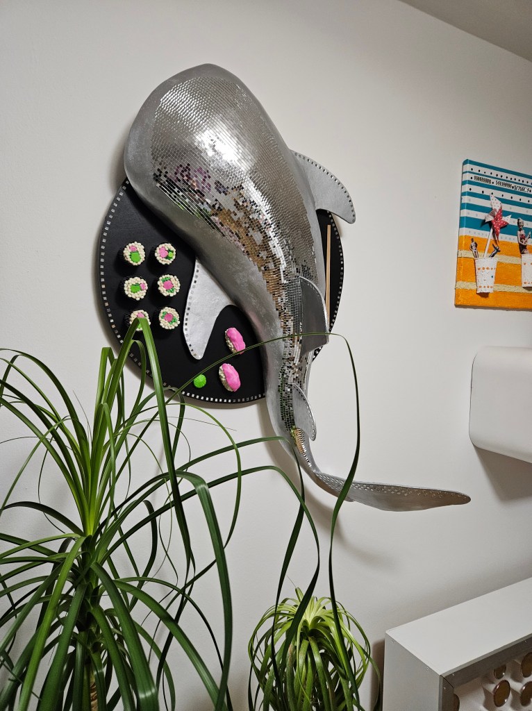 This wall sculpture appears quite stylish, but it has a deeper meaning. I admit that I enjoy eating fish, whether it is healthy or not is a matter of debate. And, of course, the issue of overfishing and illegal fishing resonates with every bite. This work developed quite unexpectedly. The initially harmless whale shark with real glass mirror tiles didn’t tell me enough by itself. So I added a black plate and sushi. A quick research revealed that whale sharks sometimes end up on plates. Can we trust this source? I’m not sure. Nevertheless, this work is a statement.